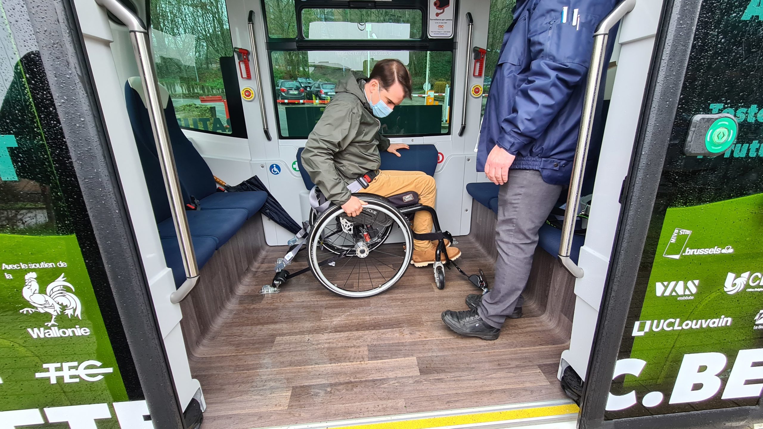 Cependant, à l’heure actuelle, ce prototype n’offre pas encore la pleine autonomie aux personnes en fauteuil roulant. En effet, un système de fixations au sol pour maintenir le fauteuil roulant et son occupant oblige l’assistance d’une tierce personne, plutôt entraînée à ce type de manipulation. Si on peut également déplorer la localisation de cet emplacement, peu inclusif (central et faisant dos à certains passagers qui voient leur espace réduit par l’encombrement du fauteuil roulant) et peu sécurisant (absence de barres de maintien et de dossier) pour l’usager en fauteuil roulant, des améliorations sont facilement envisageables.